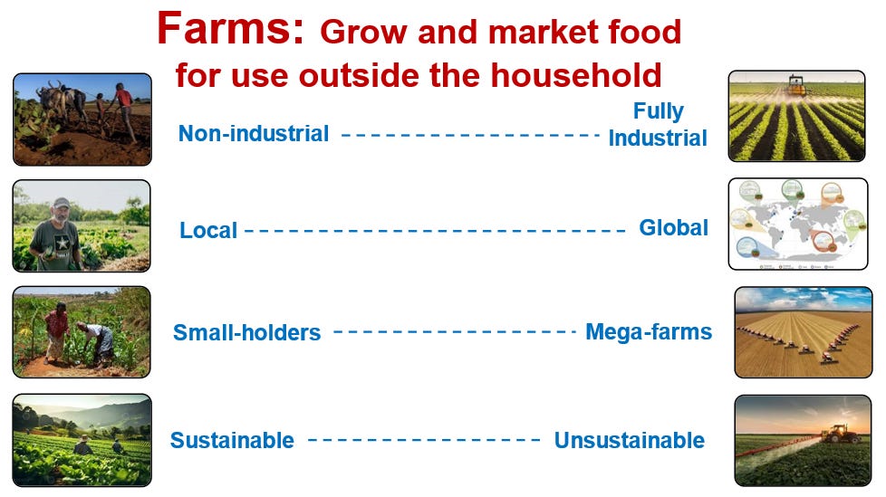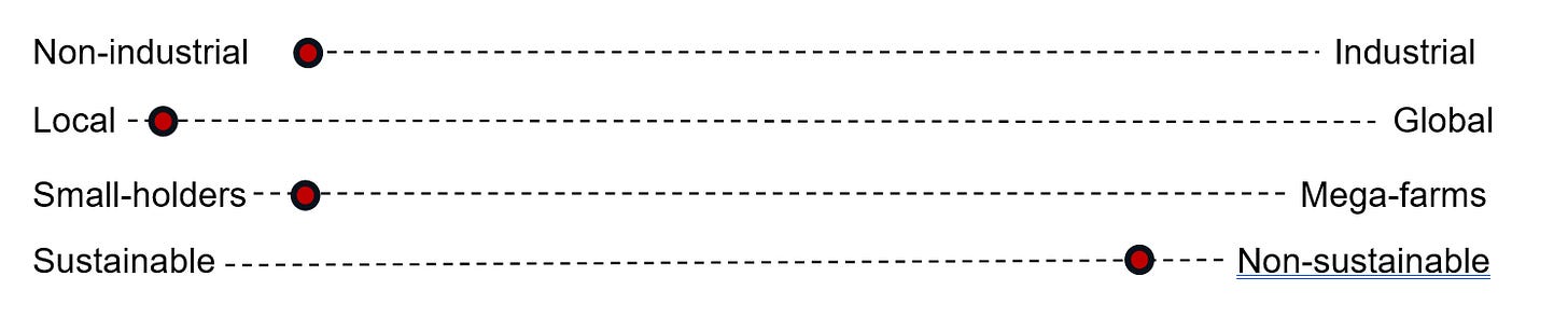 Overall, the variables you see in these farm and garden gradients beg the question, What percentage of the world’s food is supplied by small holder- and garden- type operations, and how much comes from industrialized farms? For years, the UN’s FAO (Food and Agricultural Organization) reported that small holder-ish sources, including non-industrial farms and fishing, hunting, and gathering as well as gardens, provided 70% of the world’s consumed food. Then two studies, in 20181 and 20212, proclaimed that only 30% came from small enterprises, with 70% coming from industrial spreads. The FAO promptly adopted that ratio as the new gold standard. However, those studies have been criticized as being “…full of methodological errors and assumptions that warrant further scrutiny before being universally accepted.”3 Most likely an accurate figure lies somewhere between 30 and 70 percent, but without a truly comprehensive and inclusive research effort, we’ll probably have to guess just where. I will return to this debate in a later post that considers how food production can greatly differ from consumption, a distinction both papers failed to address, amongst others.