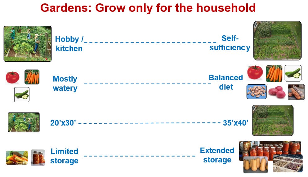 So first, most American gardens are typically described as hobby or kitchen gardens whose purpose is to provide a few fresh vegetables to supplement grocery store fare. By contrast, the goal of a self-sufficiency garden is to sustain a person or family for an extended period of time, whether it’s a day, week, or longer—even up to a year.
