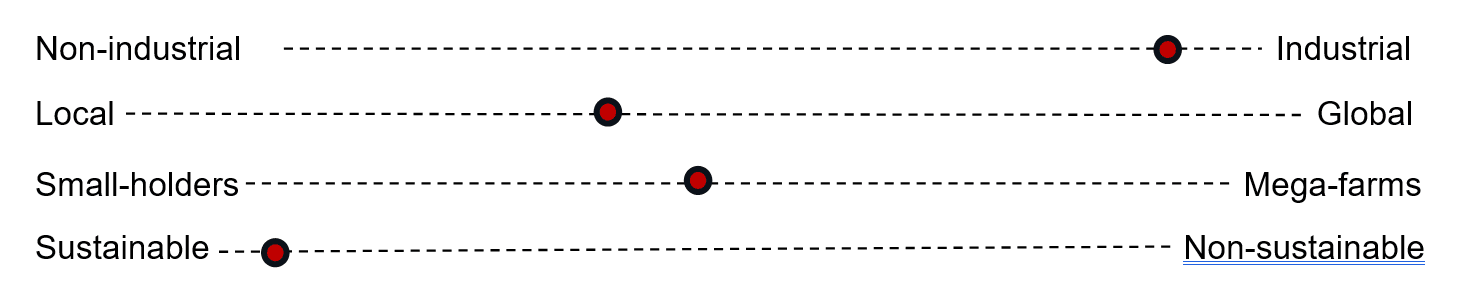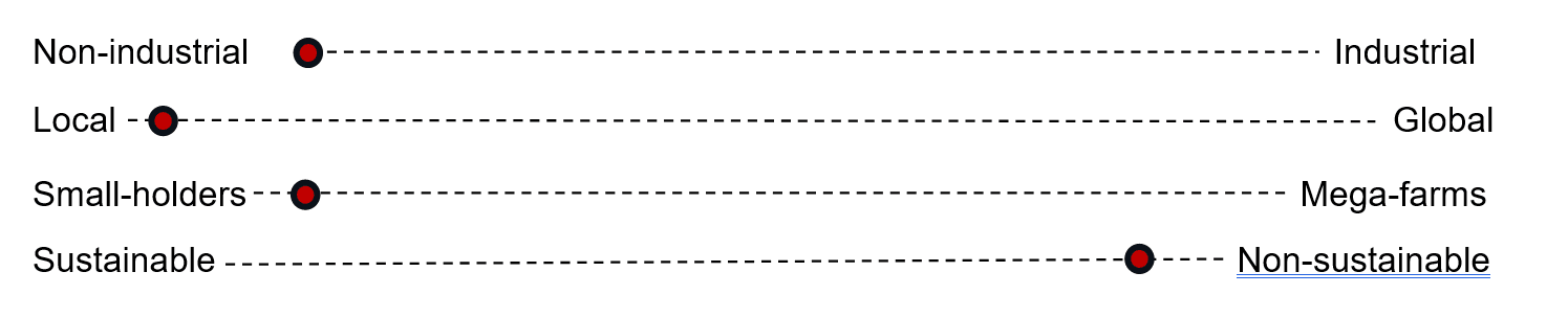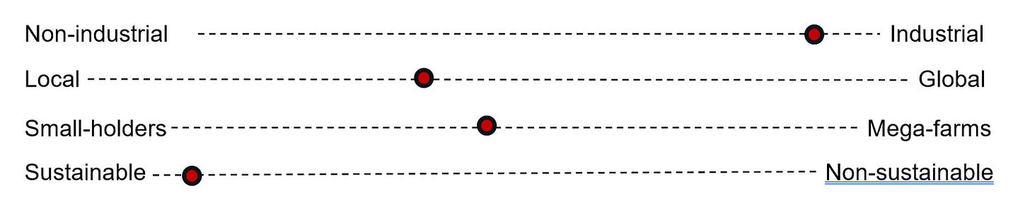 Not that absolutely any combination of features is possible; you will never find a mega-farm using only animal labor. Nor would such a farm be likely to address only local food needs, or be sustainable. So its spread would tilt toward the far right end of the gradient spread. In general, the left-hand indicators tend to cluster with one another, and do the ones on the right.