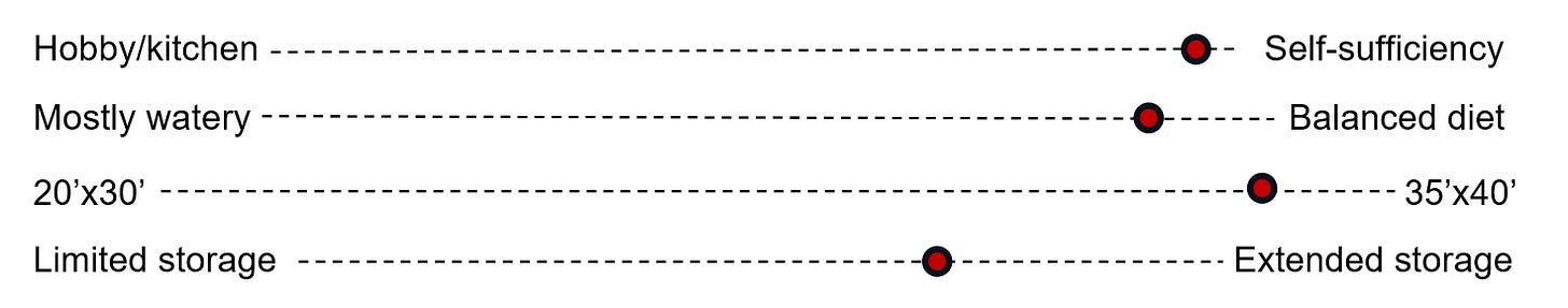 Gardens are a whole different ball game, having only food production in common with farms. They are defined as growing food almost entirely for consumption within a household. That said, gardens vary a lot in overall purpose, diet, size, and extent of storage. I’ll go into more detail about what self-sufficiency means in later posts, but for now, an overview will do.