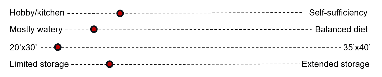 The fourth parameter—producing a limited as opposed to an extended supply of stored food—also separates the average hobby/kitchen garden from a self-sufficiency garden. In most cases, the latter requires “putting up” food by freezing, canning, pickling, or various types of dry storage. That’s not so important for a garden that mostly just supplements the grocery store.