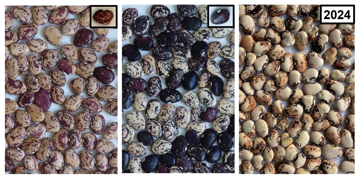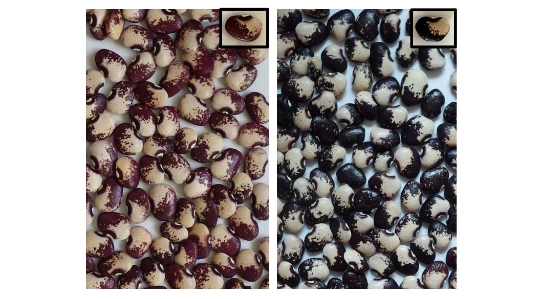 They reveal some crossover, verifying what we’ve always assumed: that despite the different color patterns, they’re all just one variety of heirloom bean. Nevertheless, violet never mixes with deep purple in any pattern, and at least in this test, the violet and deep purple pocket-patch patterns (tongue-twister there) bred true. Surprisingly, in 2024 a pattern showed up that I’d never seen before: the tri-color of tan, off-white, and a sprinkle of deep purple, variously arranged according to the pocket-patch mosaic.