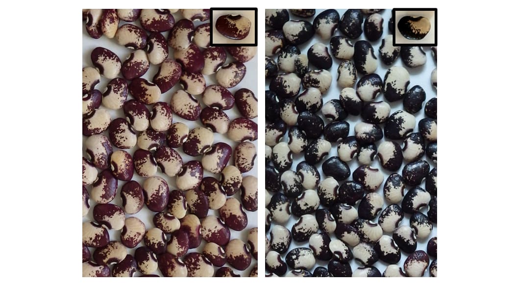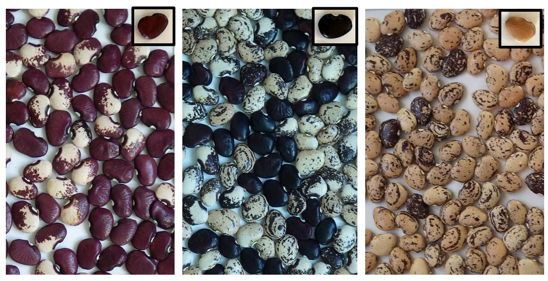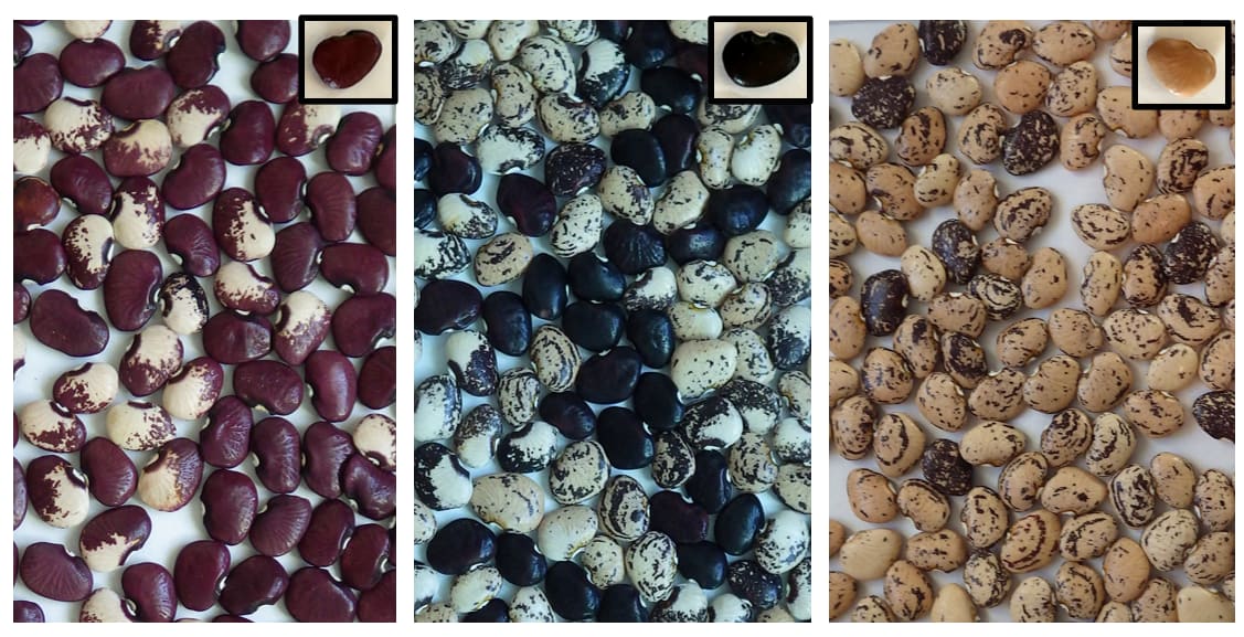 So maybe 10 years ago I decided to plant in separate spots a hill of each of the seven patterns I had at that time. The idea was to see how they were inherited when grown out. In the pics below, the color pattern that was planted is indicated by the inset at the upper right, and the adjacent beans illustrate the spread of the colors and patterns that manifested.
