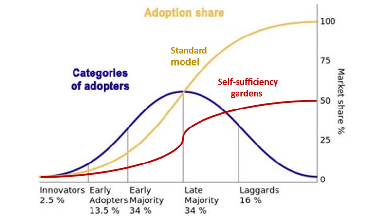 Besides, most people in high-density populations like New York City literally can’t have a garden. As well, others are physically unable to or don’t care to have one, so 100% adoption is simply not feasible. That’s why a successful curve for self-sufficiency gardens, despite following an S-pattern, is much better suited to a goal of 50%, with local food streams and industrial comprising the rest. Nevertheless, the categories of adopters within that goal, from innovators to laggards, would likely fall into the same bell-shaped curve as the standard model:
