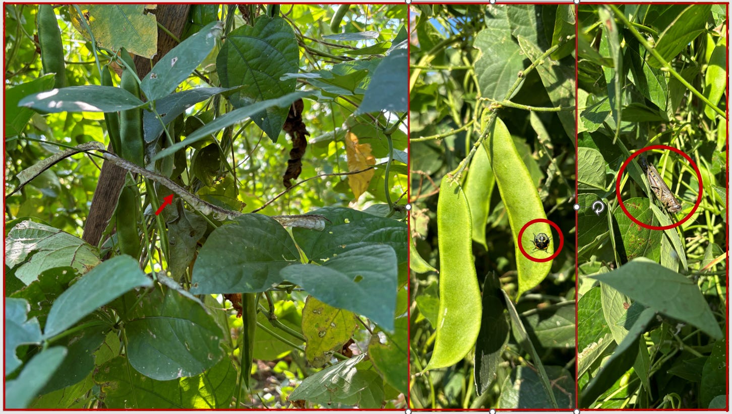 In any case, I’m sure it wasn’t just a sightseeing tourist; it must have been hunting. I looked around a little, and sure enough, I found several big, fat grasshoppers and immature stink bugs (at least I think that’s what the one in the photo was) in the bean vines. Dinnertime. Made me try to visualize how a snake would sneak up on and strike before the insect could sense the danger and scurry or jump out harm’s way. They certainly weren’t alarmed by my cell phone suddenly appearing just a few inches away to snap a pic.