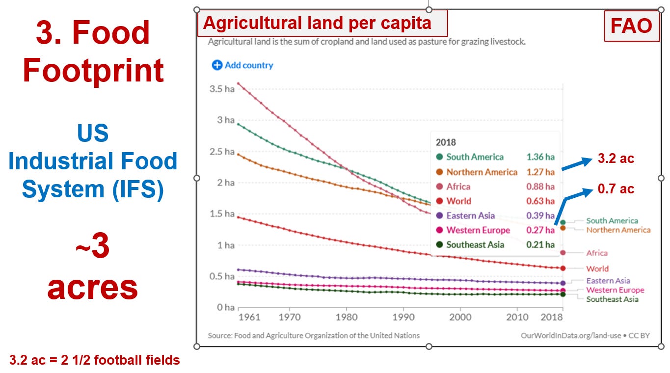 Moreover, the UN’s FAO (Food and Agriculture Organization) reported in 2022 that agricultural land per capita (the food footprint) for the U.S. was 3.2 acres. In other words, it takes about three acres (independently verifiable) to feed the average American. Is that really an efficient use of land? By way of comparison, the FAO also said that western Europe, itself heavily industrialized, needed only 0.7 acres, or about one fifth as much land, to feed a European. So how is our 3.2 acres—which you’d expect to be the world’s lowest food footprint according to Sexton—so amazingly efficient?