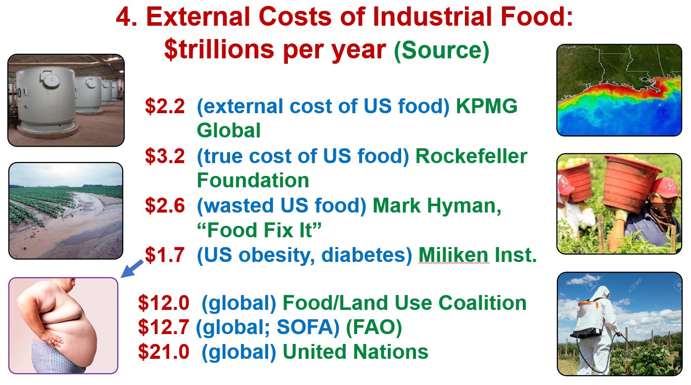That said, the most telling indicator of industrial food inefficiency is its enormous health, economic, social, and environmental external costs, which it foists off onto other cost-payers throughout our society. This amounts to some $2-3 trillion a year for the U.S., according to food system true-cost accounting mega-studies by the Rockefeller Foundation, KPMG International, the Milken Institute, the World Bank, and others. If you had a company half or more of whose operating costs, which were inflicting considerable external damage, were paid by a rich uncle so you could turn a profit, would you call that efficient? Of course not. Yet that’s the way our industrial food system works. In fact, it’s only able to function at all by throwing off much to most of its damaging operating costs