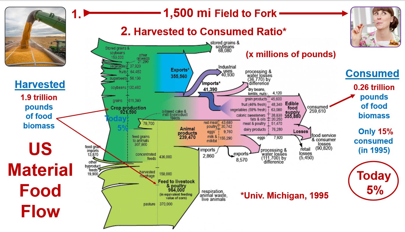 This book rests heavily on the invalid assumption that the industrial food system, of which the supposed gold standard accrues to the U.S., is amazingly efficient. Yet, as Sexton admits, “… farm products are bulky and perishable, and expensive to transport relative to their intrinsic value. This means they can’t practically be shipped long distances.” Correct. So how then could he portray our field-to-fork distance of 1,500 miles as efficient? (Answer: by ignoring full costs; see below) And contrary to what you might expect from his glowing accounts, a massive study by the University of Michigan’s Center for Sustainable Systems found that only 15% of U.S. food production (in terms of biomass) made it over that lengthy trek to the consumer’s fork1; how is that efficient? Notably, that was in 1995, before biofuels removed another sizable chunk from the food supply chain, and meat production—the least efficient part of the chain—increased by 45%. So that 15% figure is undoubtedly a good bit lower now. Again, how is that efficient?