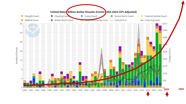 The first is the one I’ve repeatedly shown: the NOAA-depicted rate at which billion-dollar disaster have increased from 1980 to 2024.1 The red line is not part of the original graphic; I added it, and extended it into the next 25 years to illustrate and emphasize how extraordinarily serious it will be as it climbs inexorably onward and upward into the future. It is truly scary, yet most people are still oblivious to its threat despite the recent Helene floods, LA Fires, and other disasters that keep piling up.