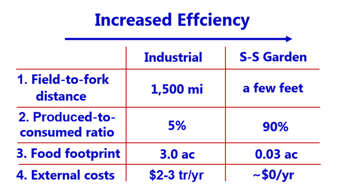 Rather than slowly dissolving like the other blue lines, the post-tipping point garden line remains solid blue, depicting an ability to stay strong and produce enough food to keep ahead of population increase and food demand. The reason it is likely to accomplish that is because a self-sufficiency garden food system is orders of magnitude more efficient than the industrial system (and likely the other blue-line methods as well), even if it improves its adaptability by the 23% that Hultgren, et al.3 predict. This outcome is indicated on the right by the four lower blue line strategies being too inefficient to meet food demand. To which the solution is to greatly increase efficiency, as would be manifested by the self-sufficiency garden system.
