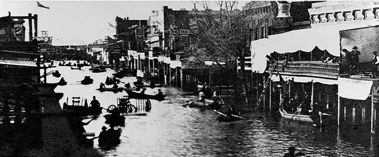 If you follow the news at all, I’m sure you’ve seen the stories about the atmospheric rivers that have picked up water from the Pacific (by evaporation) and dumped it along the west coast, causing “historic” and “catastrophic” flooding. Yet as serious as these downpours have been to those whose homes or businesses were swamped, you have to wonder what language the media will conjure up when a truly huge atmospheric river hits. The last such event inundated California’s Central Valley and surrounding regions with 43 days of rain that resulted in 15-20 feet of standing water; it created an inland sea 300 miles long and 20 miles wide. That deluge—known as the Great Flood—struck in late December 1861 – early January 1862, just after the Civil War had started back east. Thousands of people died and 200,000 cattle drowned. The capitol, Sacramento, had to move to San Francisco for six months, and the state went bankrupt for a while. Yet today, almost no one has heard about this superstorm, including those you’d think would be most aware of it: Californians.