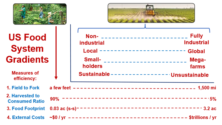 Globally, food production ranges from gardens to mega-farms along gradients of size, degree of industrialization, proximity, and sustainability. It also varies along continuums of efficiency according to four major measures thereof, as I’ve mentioned before: