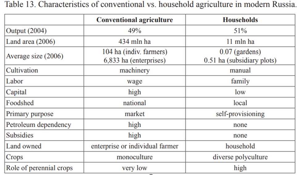 “The fact that self-provisioning is so universal, involves both rural people and urbanites, and plays a leading role in Russia’s agriculture, shows that the social institution of subsistence growing with its economic, social, and cultural characteristics has persisted from the time of the peasant economy to the present day.”