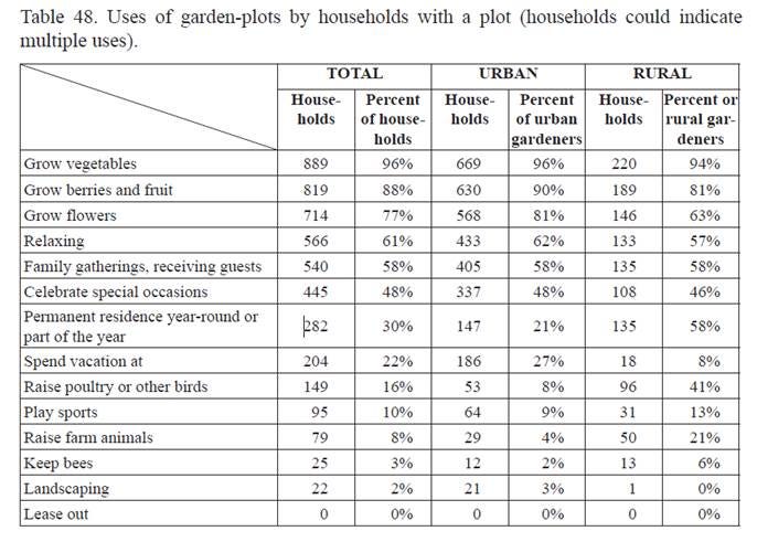Why, to produce food, of course! Yet for Russian gardeners, that’s not even the primary reason they take up a hoe. Just look at all the other reasons they have gardens (Table 48). Now, Americans also value their gardens for several reasons other than providing food, but to nowhere near the extent that Russians do. As Sharashkin emphasizes again and again, food gardens are a major social and cultural feature of their lives. You don’t have to go very far down this list to find activities that you’ll rarely, if ever, see in American gardens.